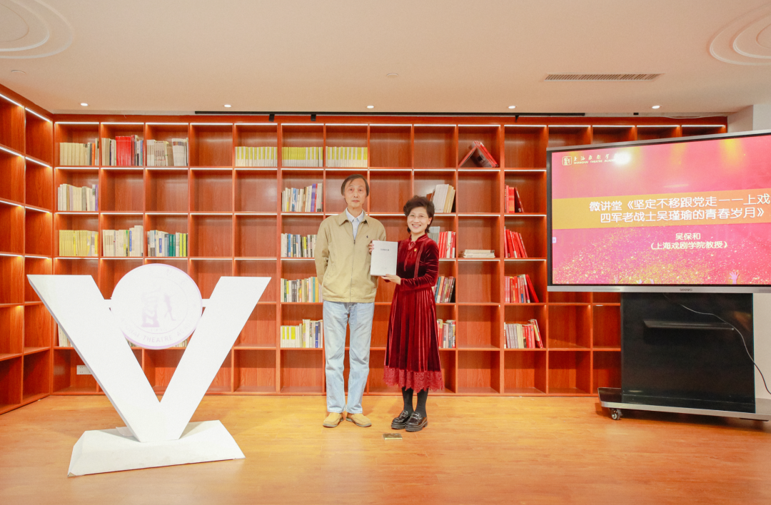 吴保和教授则以自己的父亲为例,讲述了上戏新四军老战士吴瑾瑜的故事,并带着对上戏学子的殷殷期望将其编写的《吴瑾瑜文集》赠送给上戏。