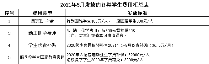 学生处在2021年5月通过建设银行学费卡打卡的方式发放以下学生费用: