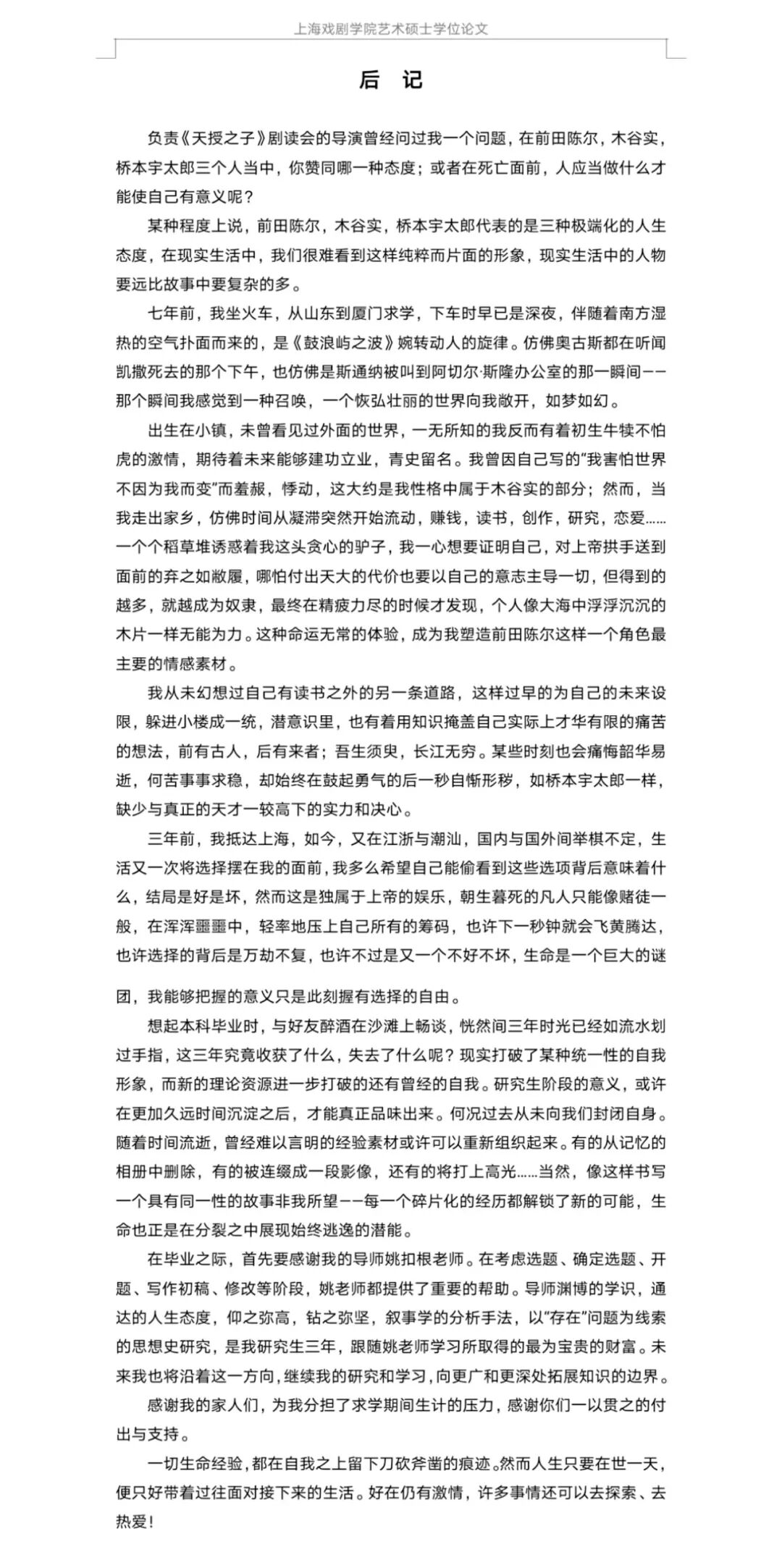 “写下这篇致谢的时候,我正坐在网吧一隅。窗外下着小雨,身旁烟雾缭绕。季节是春末,没有风,空气冷冷的。这个时候的街道,还顺着街道本身的原理发挥着机能。再过不久,日期就要换成另外一天了。”