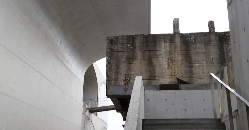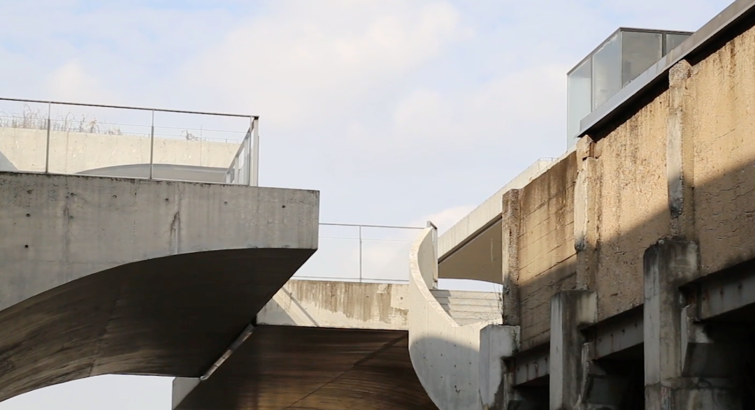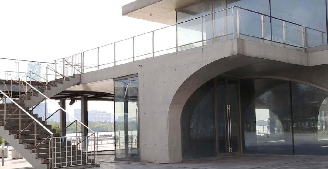 我们在打卡龙美术馆时,发现龙美术馆与其他的美术馆相区别的是——到处运用了由墙体自身延展而出的“伞拱”悬挑结构,而布局自由的剪力墙插入原先的地下室中,从而与原有的框架结构合而为一。地面以上的空间由于“伞拱”在不同方向的相对联接形成了多重的意义指向。旧式的卸载桥和新式的“伞拱”组合,“伞拱”所覆盖的地上空间,墙体和天花板都以清水混凝土表面为主,模糊了新老结构的几何分界线。