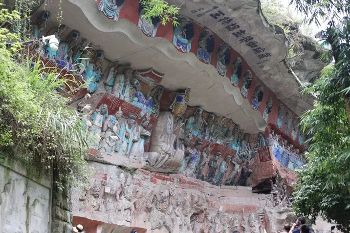 参观完博物馆,沿着路标指示牌,很快就到了宝顶山石刻的入口,高大壮观的各种各样石刻造像映入眼帘,内容多来源于佛经故事,这里保存有世界上最大的半身卧佛、鎏金的千手观音像以及六道轮回盘等,大足的壁画与雕像极具开放性,工匠们的巧思、技艺和精神令人惊叹,强烈推荐央视纪录片《大足石刻》,可以深入了解石刻的背景和知识!