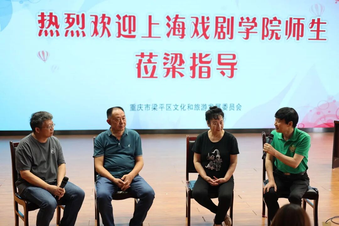 接着,实践团队受邀在重庆影剧院观看了《卖驴》《江姐》等灯戏剧目,并与梁山灯戏国家级和市级传承人面对面深入交流、座谈和访谈,充分了解梁山灯戏的演变历程和发展脉络。梁山灯戏是重庆市的传统戏剧,唱腔音乐主要有:“胖筒筒”灯弦腔、徒歌类的神歌腔和俚曲类的小调,其中“梁山调”灯弦腔比较独特。