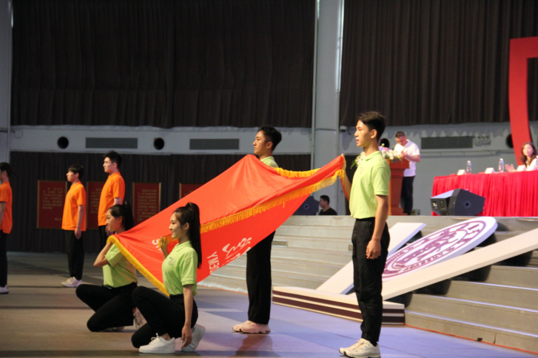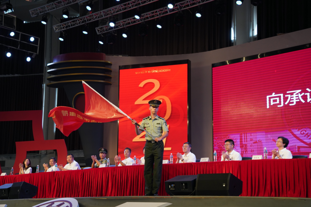 上海戏剧学院党委书记谢巍向东方绿舟承训总教官任家宝授旗。