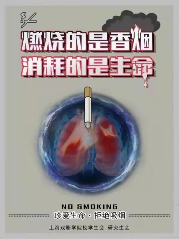 追求健康和谐的生活方式,共建生态文明的美丽中国,已成为全社会的共识。《上海市公共场所控制吸烟条例》规定:上海的室内公共场所、室内工作场所、公共交通工具内禁止吸烟。为树立和展现教育工作者和青年学生良好的精神面貌,养成文明健康的生活习惯,创造洁净、优美的校园环境——办公室、教室、寝室、食堂、卫生间等公共场所不再“乌烟瘴气”,烟蒂、烟盒在校园销声匿迹。让我们共同努力,积极控烟,构建上戏美丽校园。
