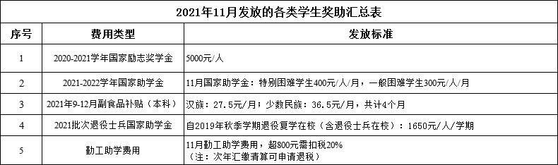 关于2021年11月发放的各类学生奖助津贴的说明