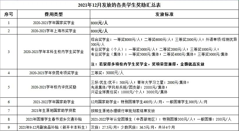学生处在2021年12月通过建设银行学费卡打卡的方式发放以下学生奖助津贴: