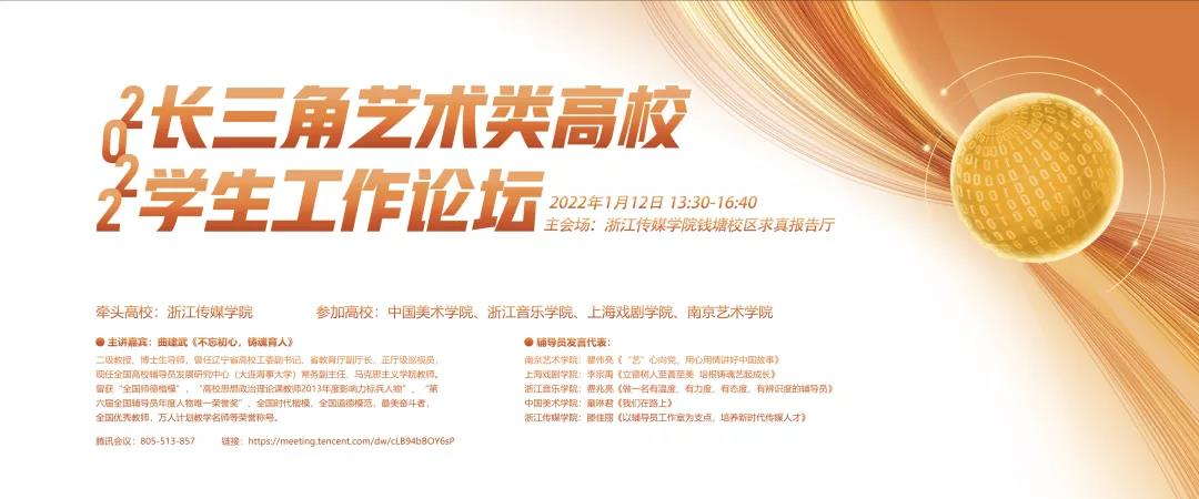 1月12日下午,由浙江传媒学院发起、上海戏剧学院、南京艺术学院、中国美术学院、浙江音乐学院等高校参加的2022长三角艺术类高校学生工作论坛通过网络形式举行。我校全体辅导员参加论坛,舞台美术系李宗禹老师代表我校辅导员进行了交流发言。