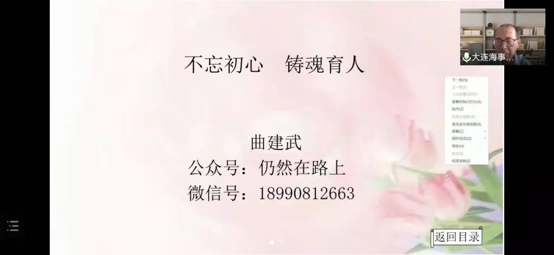 接着,大连海事大学马克思主义学院博士生导师、全国师德楷模、全国道德模范、最美奋斗者、全国辅导员年度人物荣誉奖等称号获得者曲建武教授作了《不忘初心,铸魂育人》教育专题讲座,与五所高校辅导员代表进行工作经验交流。曲建武首先用诙谐幽默的话语、结合自己30多年思想政治教育工作的实践和思考,大量生动的思想政治教育实践工作案例和感动人心的教育故事,讲述了一名资深辅导员的育人情怀。接下来曲教授从大学文化属性、民族学生教育、辅导员科研、心理危机预防等方面阐述了思想政治教育的目标、以及如何做好一名高校辅导员、如何做好学生成长道路上的引导着。曲教授的报告,感情真挚、震撼人心,深深感染了参与讲座的每一位师生。